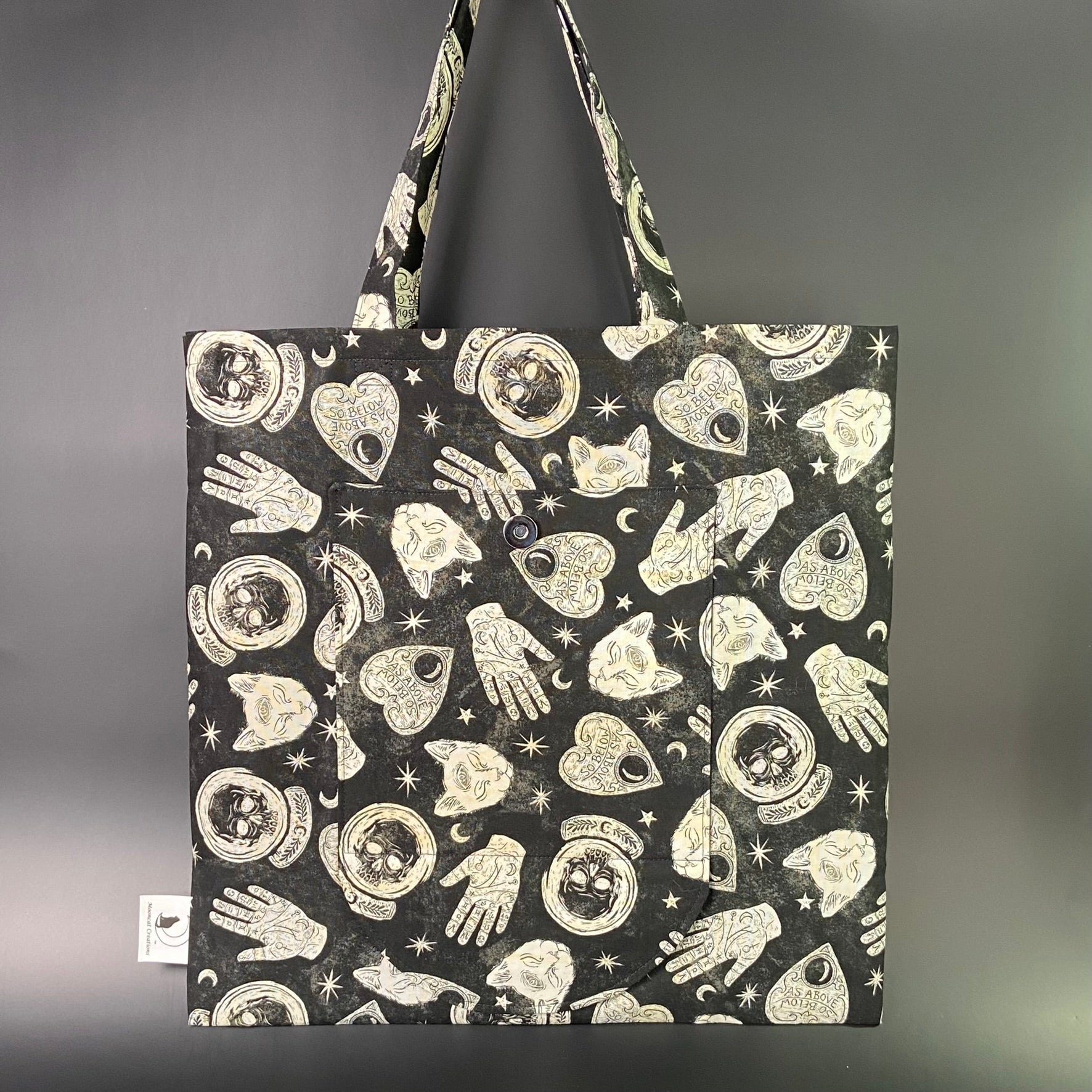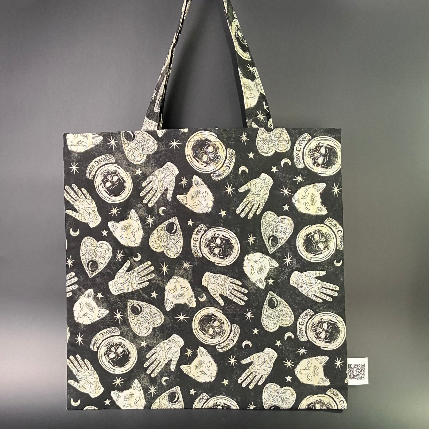 This enigmatic bag boasts a striking fabric featuring palmistry and planchettes. A bewitching statement of style for those who revel in magick.